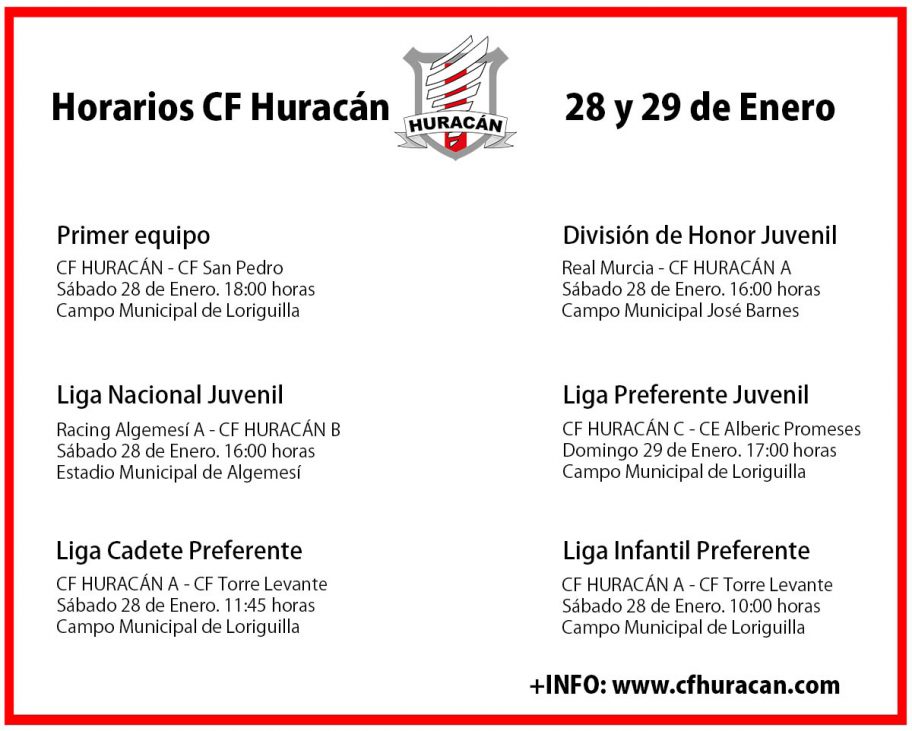 Ya puedes consultar los horarios de todos los equipos del CF Huracán durante el fin de semana del 28 y 29 de enero. También puedes verlos en la agenda oficial del CF Huracán.